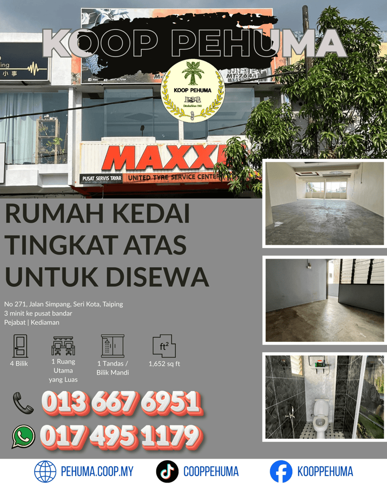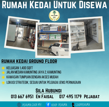 KOOP PEHUMA menawarkan rumah kedai tingkat atas untuk disewa yang terletak di lokasi strategik :