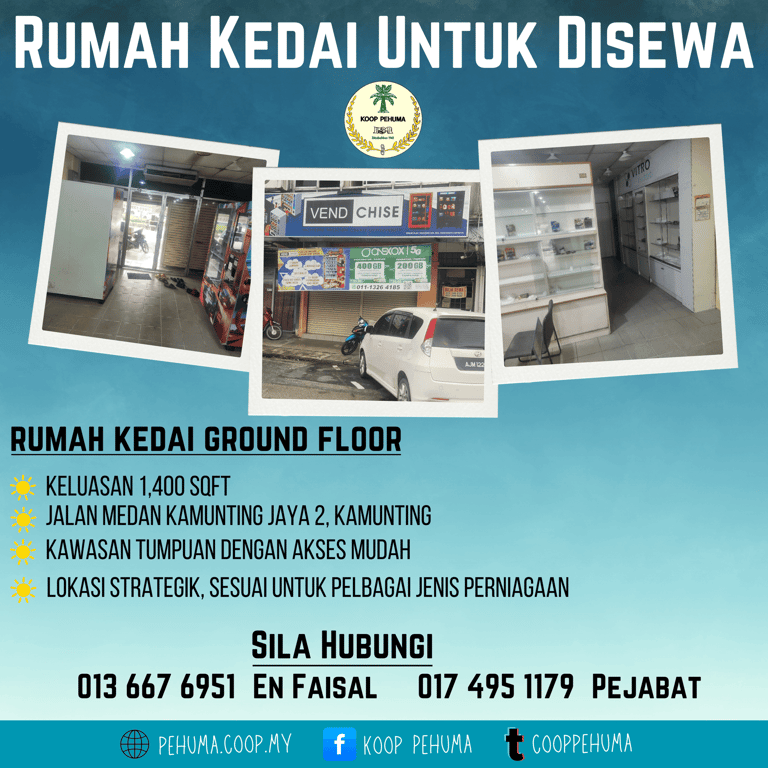 KOOP PEHUMA menawarkan rumah kedai ground floor untuk disewa yang terletak di lokasi strategik: