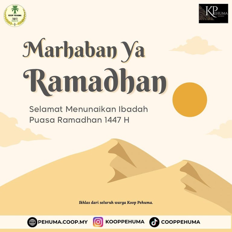 Sempena kedatangan bulan yang penuh keberkatan, Koperasi PEHUMA mengambil kesempatan untuk mengucapkan Selamat Menyambut Ramadan 1447H kepada seluruh anggota, warga kerja serta komuniti setempat.